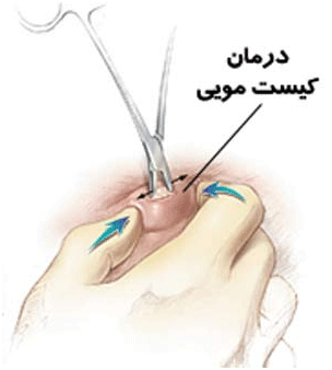 2- جراحی به روش بسته : در این روش، کیست حاوی مو پس از انجام بیهوشی عمومی و یا بی حسی از کمر خارج می شود و محل عمل بخیه زده می شود و حدود ده روز بعد، بخیه ها کشیده می شوند.